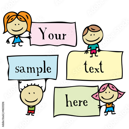 School boy and girl hold blank white paper poster. Vector illustration in comic pop art style. Put your own text.
