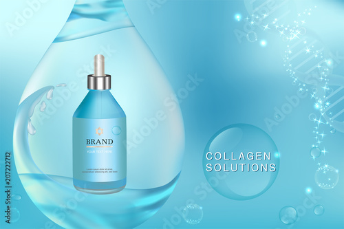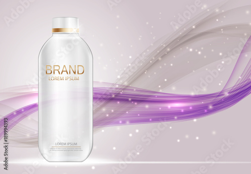 Drinking water ad. Vector realistic illustration of big plastic bottle and glass of pure clean water, bubbles, ice cubes, water pouring. Brand advertising poster template.
