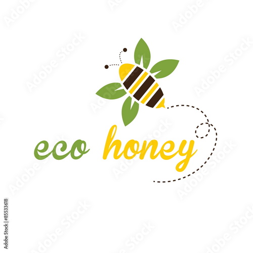 100 percent pure honey icon. Vector sticker, label or logo with headline text, bee and flower design isolated on white background