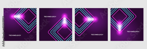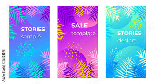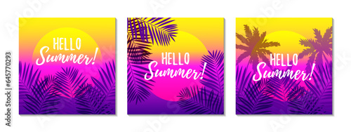 Purple neon frame set with tropical banana, monstera plants, palm tree leaves, vector isolated illustration. Fluorescent colors exotic jungle plant leaves borders.