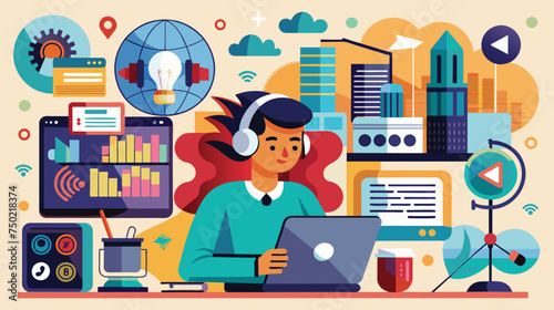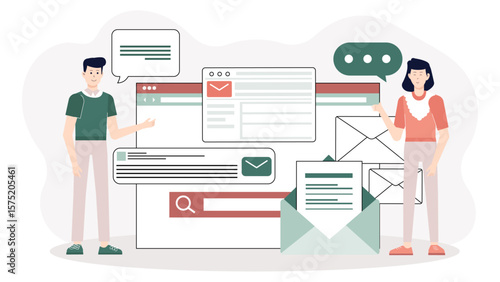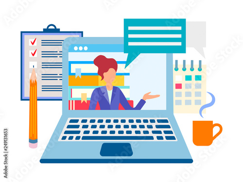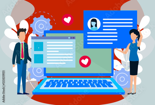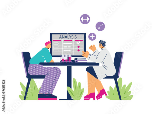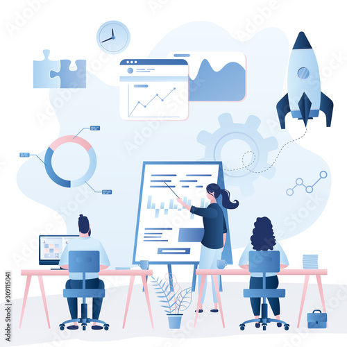 Quantum computer engineering vector poster template. Group of people physicists engineers working with quantum computer chip, flat style design illustration. Quantum computation research.