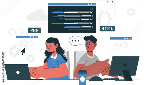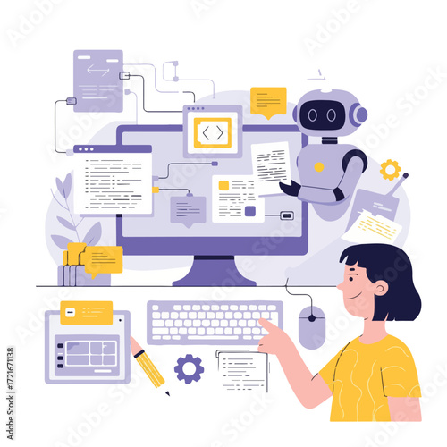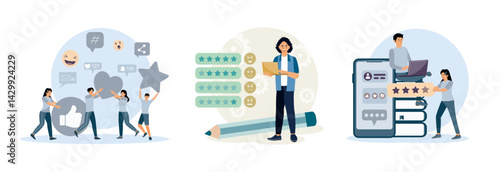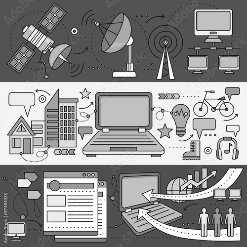 Quantum computing technology vector poster template set. Desktop with quantum computer, chip, shield. Quantum computing research, space exploration concept for flyer, banner etc.