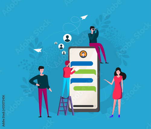 Mobile adventure quest games vector concept illustration. Huge smartphone with game route and reward at the very end, male and female characters with magnifier, telescope. Quest mobile gaming.