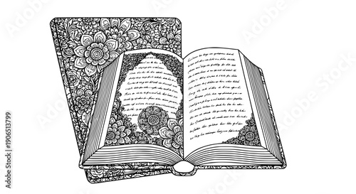 Quran, Islam religion Holy book. Ancient Koran, islamic sacred texts. Muslim holy scriptures, vector vintage sketch style illustration isolated on white background.