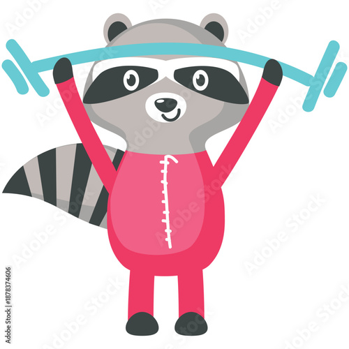 Raccoon training with barbell vector icon. Cartoon animal enjoy gym fitness exercise. Cute character athlete pumping muscle illustration isolated on white background