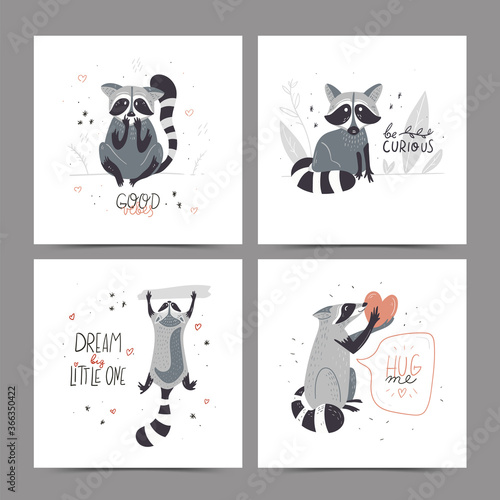 Cute raccoon birthday cards. Happy birthday greeting card, invitation vector templates for kids with funny raccoons, balloons, gift boxes, cake, hearts, string flags and handwritten text.