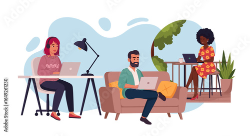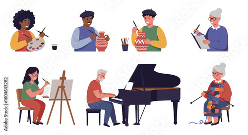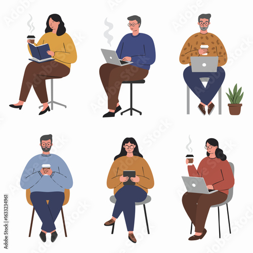 Radio podcast set, vector flat isolated illustration. People creating podcast in studio and listening to audio programs on smartphone and laptop computer. Podcasting, online radio.