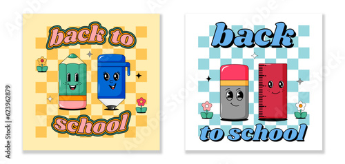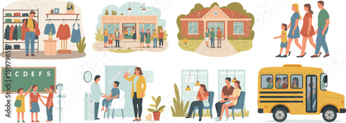 Rafting equipment and protective gear set, flat vector isolated illustration. Rubber raft inflatable boat, paddles, kayak, tent, suit, helmet, gloves, first aid kit, inflatable life jacket, backpack.