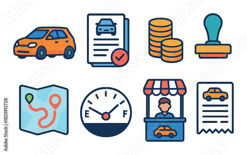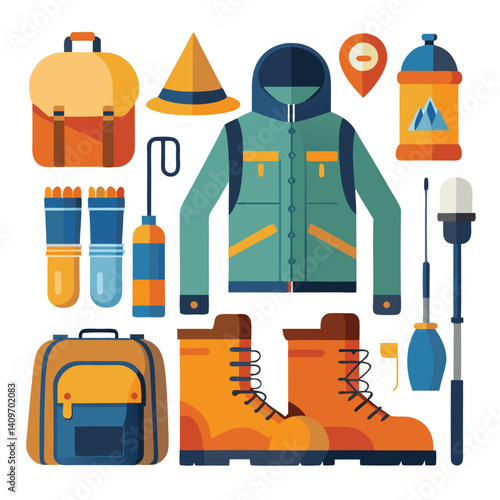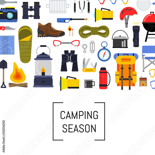 Rafting icon set. Vector illustration of white water rafting sport equipment, protective gear and camping items isolated on white background.