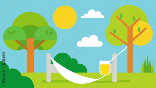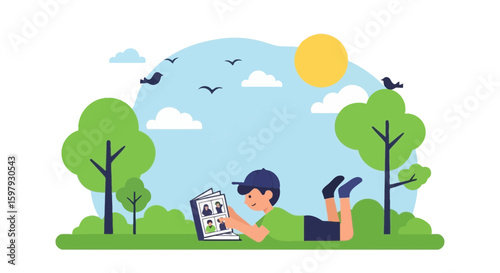 Vector illustration of young couple walking in the rain with umbrellas. Blue sky crested with rainbow, flat style design element.