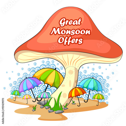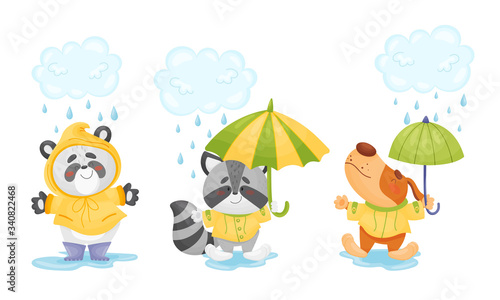 Rainy autumn vector flat style design illustration. Umbrella, rubber boots, clouds, pumpkin, acorns, mushrooms, leaves, cup of tea with lemon. Autumn composition for web banner, website page etc.