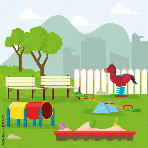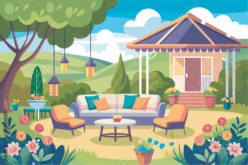 Wet, rainy weather concept vector illustration. People walking in the rain in raincoats and with umbrellas, rainbow. Flat style design.