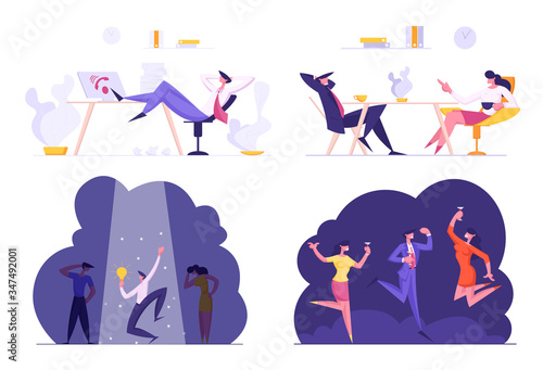 Autumn scene, woman holding umbrella, couple walking in the rain, man running away from rain, vector illustration. Fall wet rainy weather concept for web banner, website page etc.