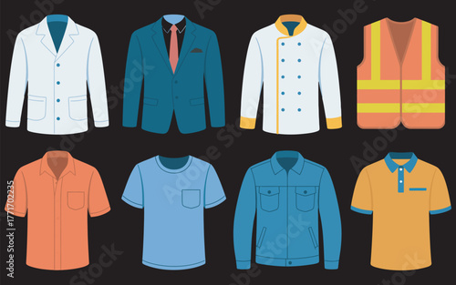 Doctor suit set, vector isolated illustration. Realistic white coat or lab coat, shirt, blue hat and mask, black pants, shoes and tie. Medical uniform for healthcare professionals.