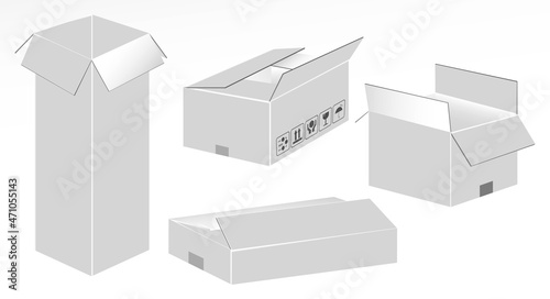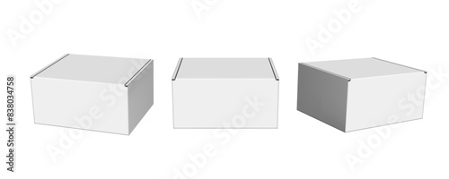 Realistic slide box in different position and view mockup set with ribbon to pull out vector illustration isolated on grey background. Closed and opened gift blank cardboard container