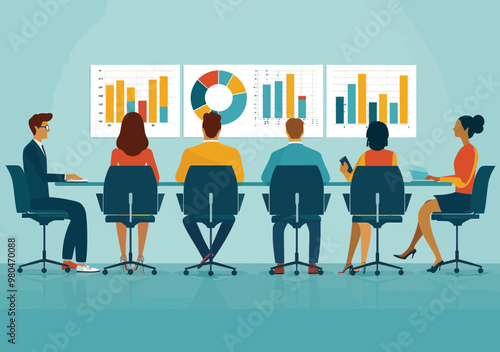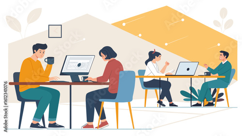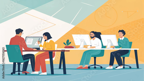 Staff recruitment or hiring concept. Vector isometric illustration of empty office chair, desk with computer and vacancy sign, employer and people searching for job.