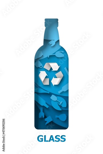Recycle glass bottle with glass garbage and recyclable material sign, vector illustration in paper art craft style. Waste reuse and recycle. Save environment.