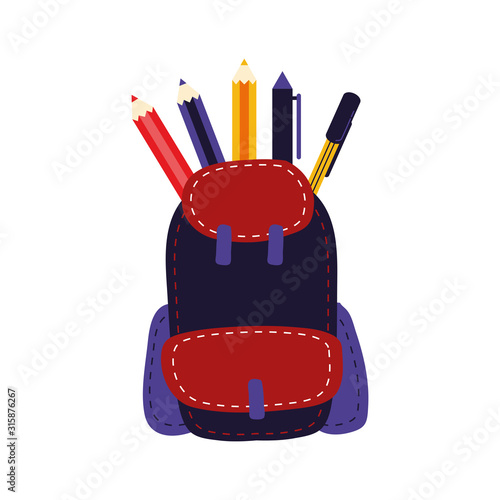Red backpack with school supplies, vector isolated illustration. Realistic rucksack with zipper, pockets, straps. Children school bag with notebook, ruler, scissors, pens, pencils, paint brushes.