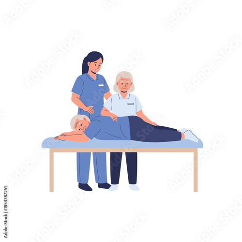 Rehabilitation center. Massage therapy, flat vector illustration. Female physiotherapist giving back massage to patient lying on the table. Rehabilitation and physiotherapy treatment of injured people