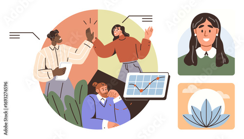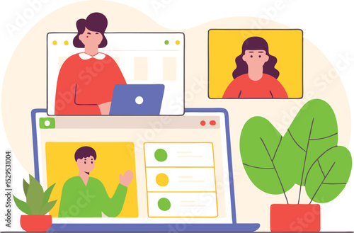 Relatives communicating online via group video call chat, flat vector illustration. Virtual meeting, connection with family and friends. Video conference technologies.