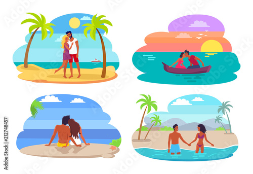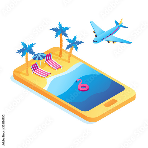 Remote job, freelance concept. Isometric mobile phone with business man working during relax at beach resort of topical island 3d vector
