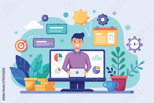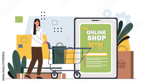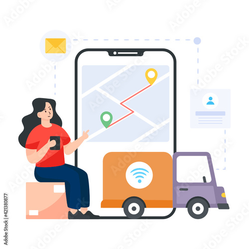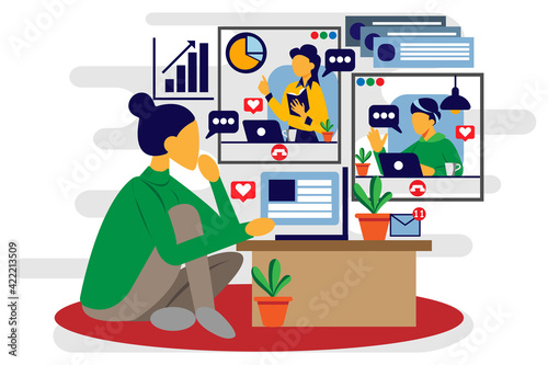 Workplace on huge smartphone screen and young girl with cup of coffee, vector flat illustration. Freelancer business woman working remotely from home due to coronavirus pandemic, quarantine. Stay home