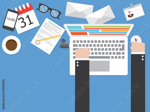 Freelancer, business man working remotely from home office using laptop computer, vector flat illustration. Newspaper sheet, smartphone, cup of coffee, cactus plant on table. Home workspace concept.