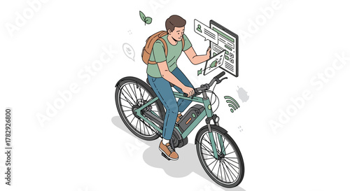 Two micro male characters holding huge bicycle and man riding bike, vector illustration. Rental service concept for web banner, website page etc.