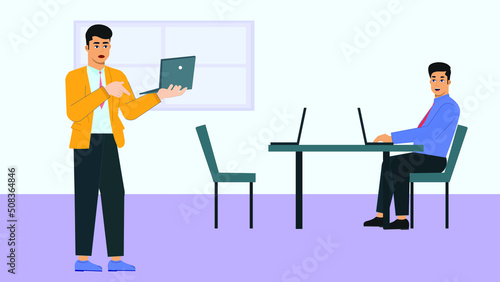 Two friends drinking beer and talking to each other while sitting at table, vector flat illustration isolated on white background. Restaurant beer concept for web banner, website page etc.