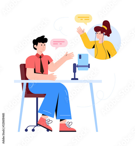Young man giving compliments to the girl in chef uniform standing next to restaurant table, vector flat illustration isolated on white background. Restaurant catering business.