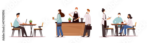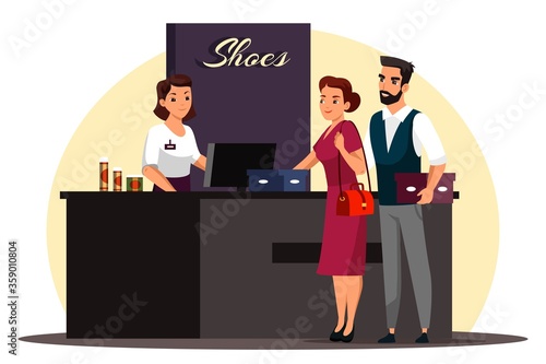 Restaurant receptionist female and couple of visitors cartoon characters standing at reception desk, vector flat illustration isolated on white background. Restaurant catering business.