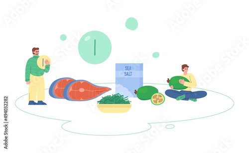 Restaurant chefs tiny male female characters cooking huge delicious sandwich avocado toast, vector flat illustration. Toasted slice of bread with fresh avocado, tomato, seasoning. Healthy organic food