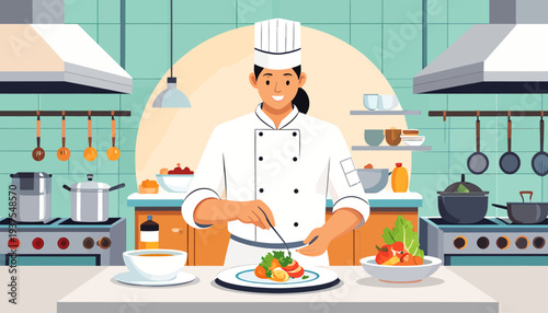 Restaurant kitchen with chef cook dish dinner, vector illustration. Restaurant inteior, cooking food. Professional chef catering serivce.