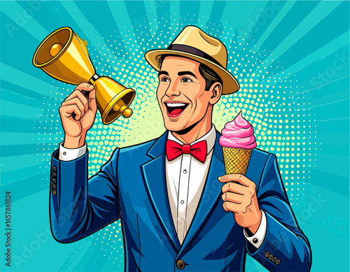 Rich handsome guy hold money and point his finger up. Business and finance concept vector illustration in retro comic pop art style.