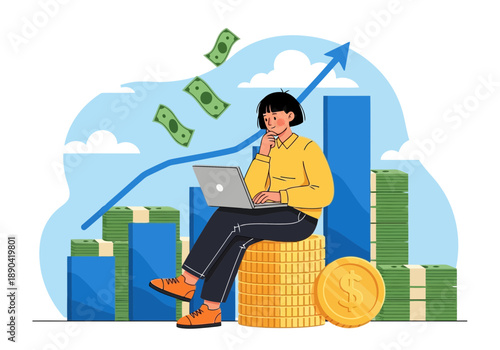 Rich man sitting on cash money stack and setting fire to dollar bill, flat vector illustration. Wealthy businessman, successful millionaire. Financial success, wealth.