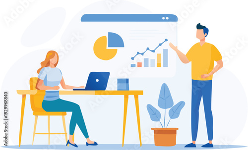 Robot machine working a lot faster than businessman, flat vector illustration. Robots superiority. Automation. Artificial intelligence vs human intelligence.