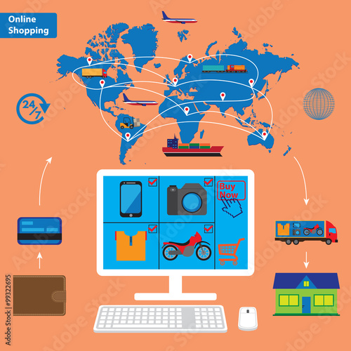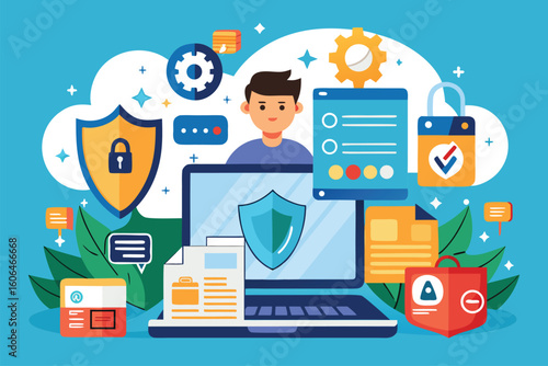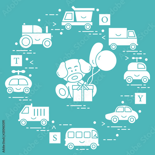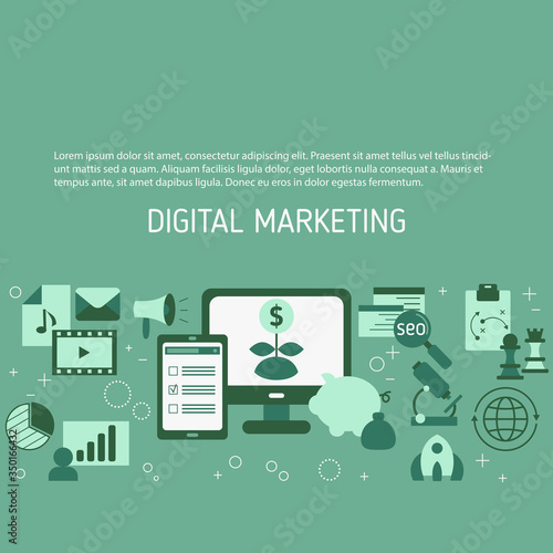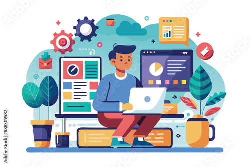 Robotics vector flat illustration. Robot, industrial robotic arm, charts, graphs dashboard, keyboard, dollar coins, flash drives. Business process automation concept for web banner, website page etc.