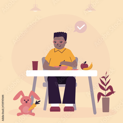 Robotics school for children. Smart boy student making robot, flat vector illustration. Kids robotics engineering.