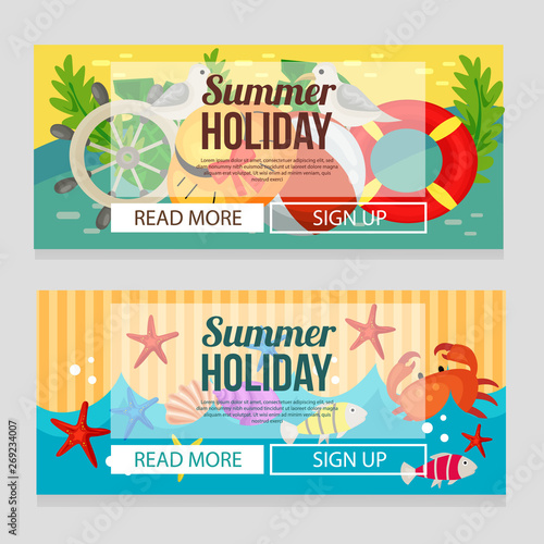 Summer holidays vector web banner template. Happy girl enjoying rollerblading along the beach promenade, retro flat style design illustration. Summer beach vacation, roller skating, you deserve it.