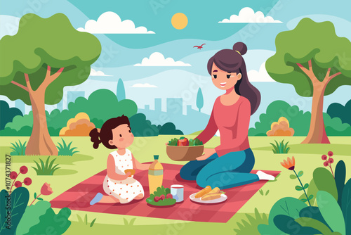 Romantic couple on picnic, flat vector illustration. Happy man and woman sitting on blanket in park, relaxing and drinking wine. Picnic basket on grass. Summer outdoor leisure activities.
