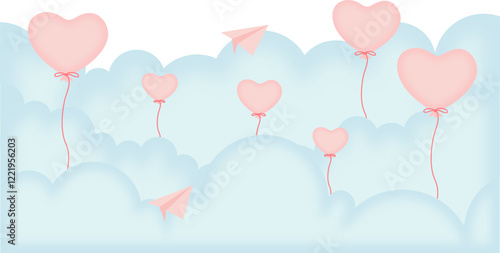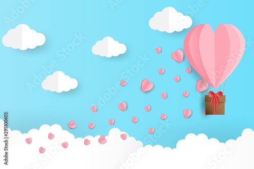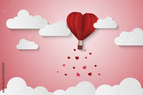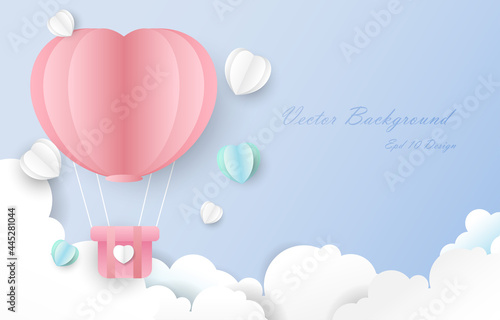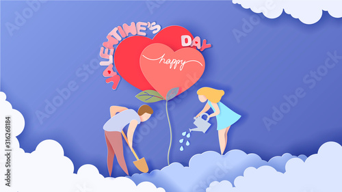 Layered paper cut style sky with fluffy clouds and happy couple holding hands, vector illustration in paper art craft style. Romantic couple background with copy space for web banner, website page etc
