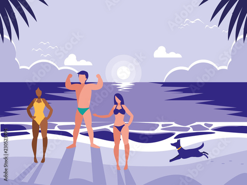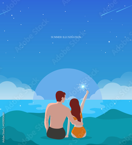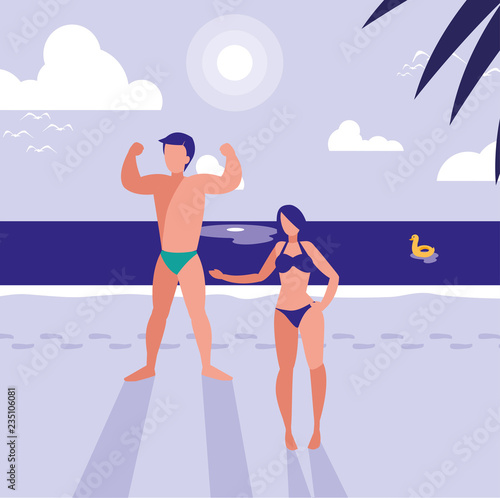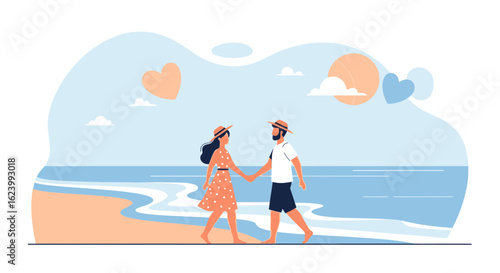 Happy couple in love hugging on beach, vector flat illustration. Romantic summer vacation, honeymoon concept for web banner, website page etc.