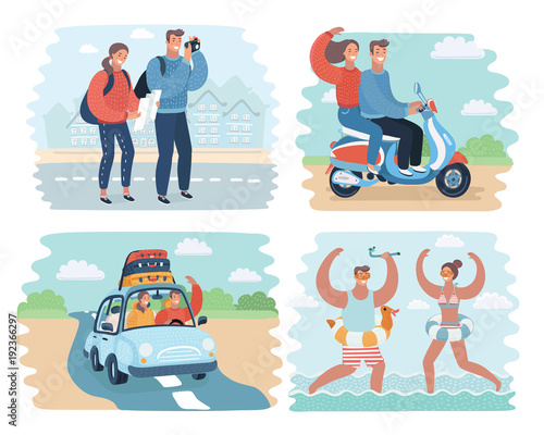 Romantic vacation vector website template, web page and landing page design for website and mobile site development. Happy couple visiting famous landmarks riding scooter. Travel concept.