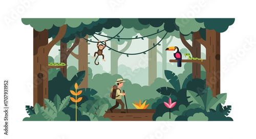 Rope adventure park flat vector illustration. Happy adult people and children climbing trees, overcoming obstacles enjoy extreme recreation time outdoors