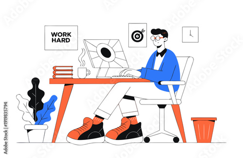 Sad business man, dismissed employee leaving the office, flat vector illustration. Process of ouster is supervised by security guard. Crisis, staff reduction, layoff.