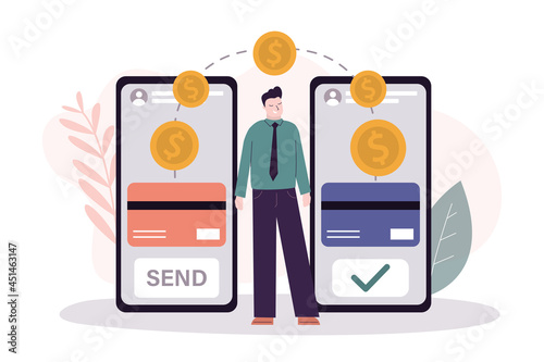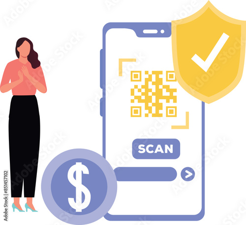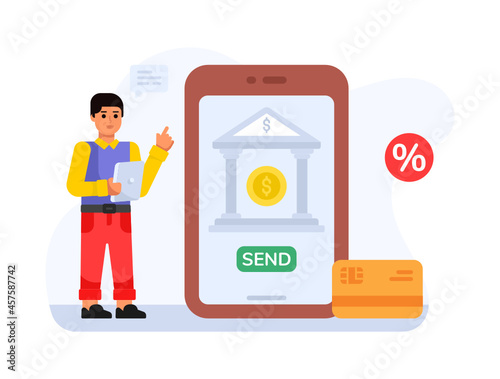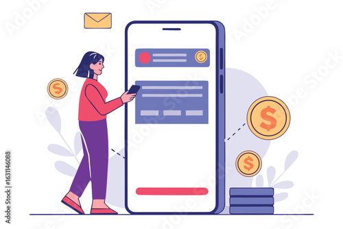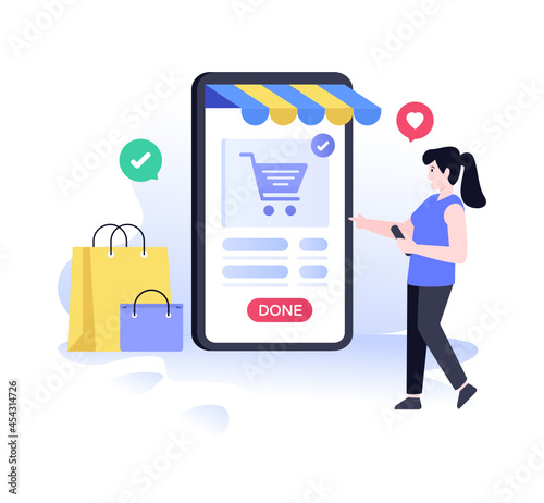 Sale promotion gift box on smartphone screen, woman with shopping bags, credit card, flat vector illustration. Online shopping, internet payment technologies.