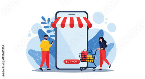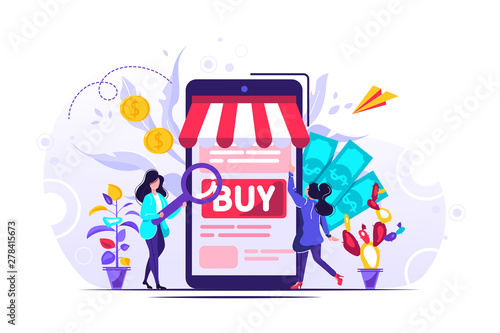 Huge Sale tag and micro characters happy women shopping, vector flat style design illustration. Seasonal clearance sale and discounts promotion, successful holiday marketing campaign concept.