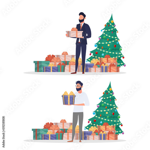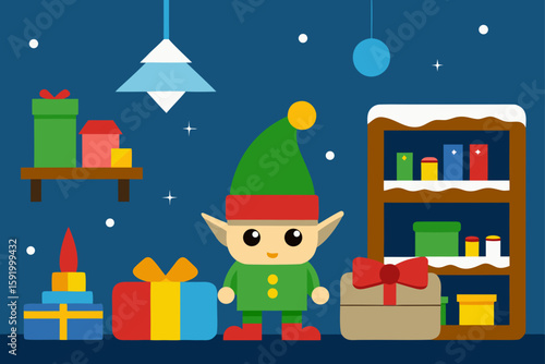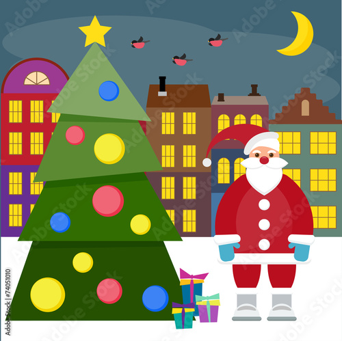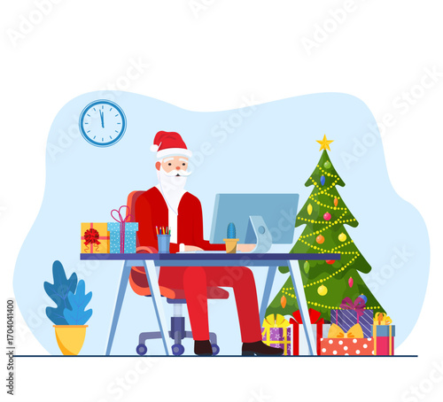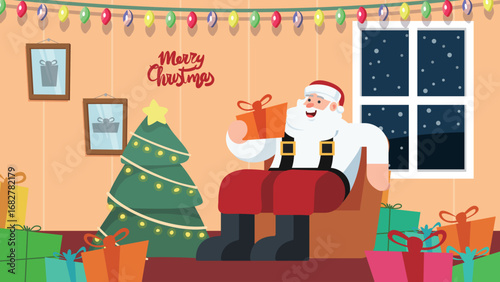 Santa Claus giving gift box to happy girl kid, flat vector illustration. Living room interior with decorated Christmas tree and gifts. New Year night. Christmas holidays celebration.