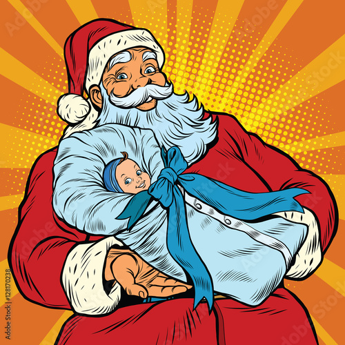 Santa claus reading fairy tales book. Vector illustration in comic pop art style. Christmas concept poster.