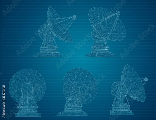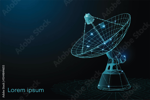Satellite dish low poly wireframe mesh made of points, lines and shapes. Vector polygonal art style design. Telecommunications poster banner template with copy space.